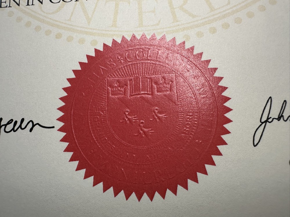 加拿大滑铁卢大学毕业证书证书带有激凸烫金工艺。店家采用的纸张是180克的 纸张也是偏黄 不是白色的,拿在手里的质感很棒。对比了同学的滑铁卢大学毕业证原价,发现是一模一样的 。唯一的瑕疵就是不能做留服认证.
